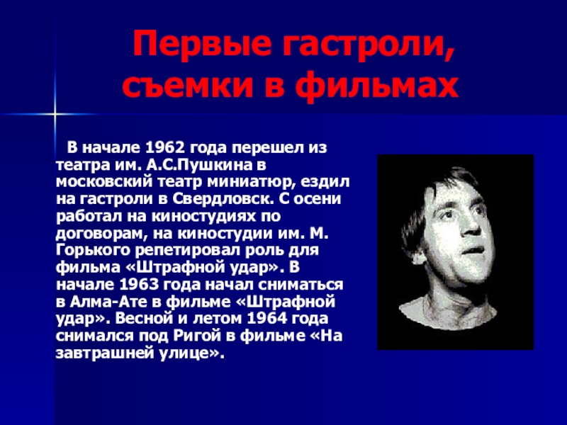 В начале 1962 года перешел из театра им. А.С.Пушкина в московский театр миниатюр, ездил на гастроли в Свердловск. С осени работал на киностудиях по договорам, на киностудии им. М.Горького репетировал роль для фильма «Штрафной удар». В начале 1963 года начал сниматься в Алма-Ате в фильме «Штрафной удар». Весной и летом 1964 года снимался под Ригой в фильме «На завтрашней улице».