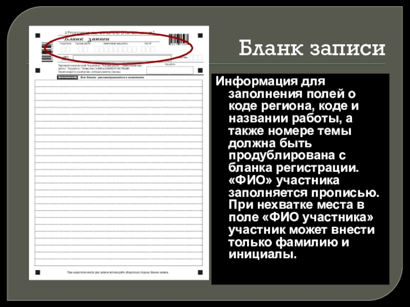 Слайд 20Правила заполнения бланка регистрации и бланков записи участников итогового сочинения