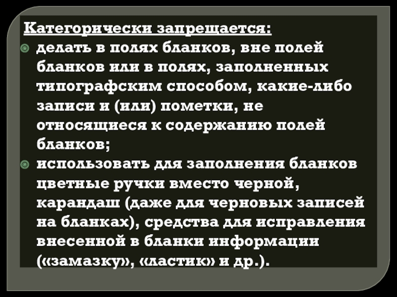 заполненных типографским способом, какие-либо записи и (или) пометки, не относящиеся к содержанию полей бланков;