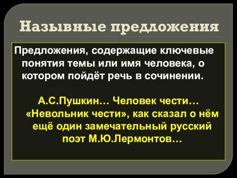 Предложения, содержащие ключевые понятия темы или имя человека, о котором
