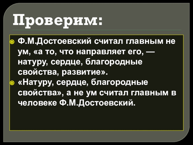 «Натуру, сердце, благородные свойства», а не ум считал главным в человеке Ф.М.Достоевский.
