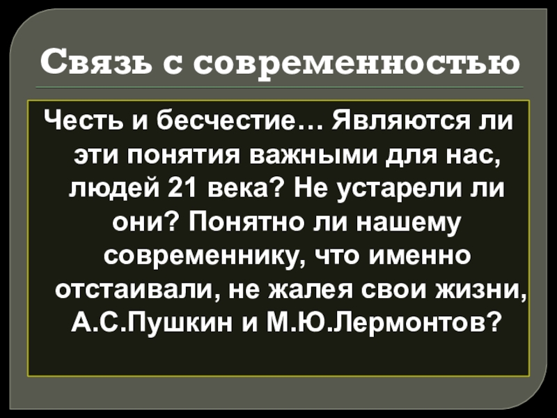 нас, людей 21 века? Не устарели ли они? Понятно ли нашему современнику, что именно отстаивали, не жалея свои жизни, А.С.Пушкин и М.Ю.Лермонтов?