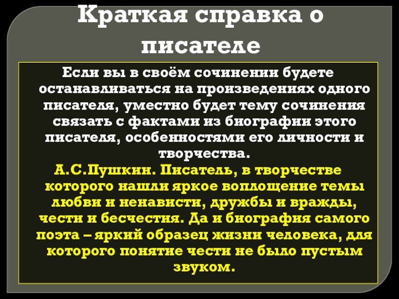 А.С.Пушкин. Писатель, в творчестве которого нашли яркое воплощение темы любви и ненависти, дружбы и вражды, чести и бесчестия. Да и биография самого поэта – яркий образец жизни человека, для которого понятие чести не было пустым звуком.