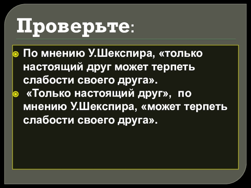 «Только настоящий друг», по мнению У.Шекспира, «может терпеть слабости своего друга».