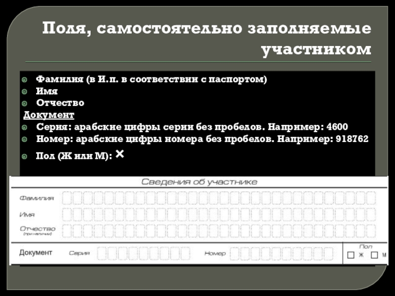 Каждое поле в бланках заполняется, начиная с первой позиции (в том числе и поля для занесения фамилии, имени и отчества участника).