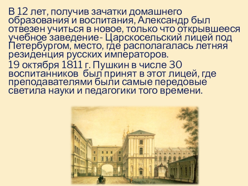 19 октября 1811 г. Пушкин в числе 30 воспитанников был принят в этот лицей, где преподавателями были самые передовые светила науки и педагогики того времени.