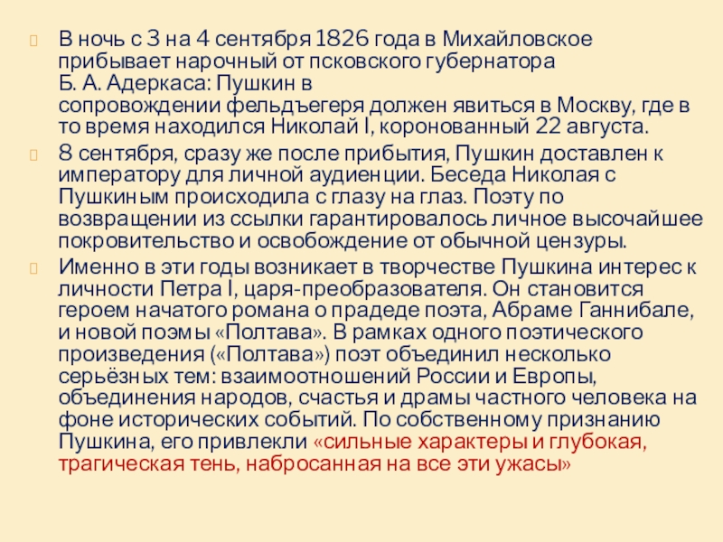 от псковского губернатора Б. А. Адеркаса: Пушкин в сопровождении фельдъегеря должен явиться в Москву, где в то время находился Николай I, коронованный 22 августа.