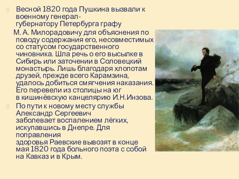 Слайд 7Весной 1820 года Пушкина вызвали к военному генерал-губернатору Петербурга графу