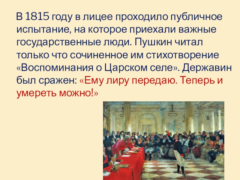 Слайд 5В 1815 году в лицее проходило публичное испытание, на которое приехали