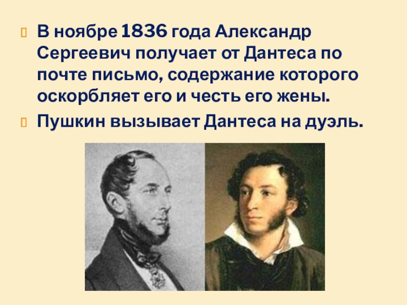 Слайд 14В ноябре 1836 года Александр Сергеевич получает от Дантеса по почте