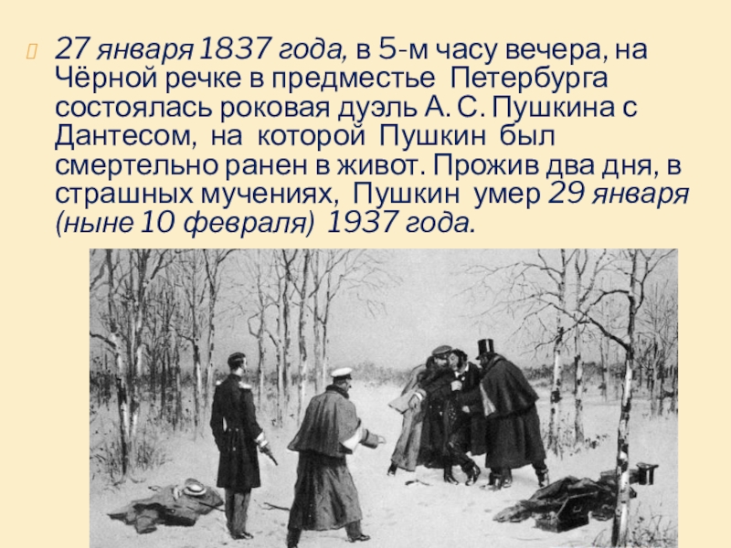 Слайд 1527 января 1837 года, в 5-м часу вечера, на Чёрной речке