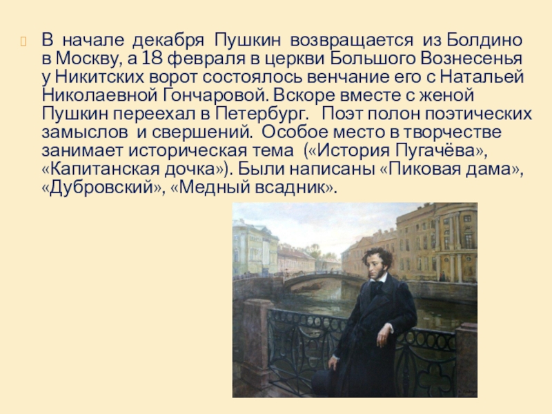 февраля в церкви Большого Вознесенья у Никитских ворот состоялось венчание его с Натальей Николаевной Гончаровой. Вскоре вместе с женой Пушкин переехал в Петербург. Поэт полон поэтических замыслов и свершений. Особое место в творчестве занимает историческая тема («История Пугачёва», «Капитанская дочка»). Были написаны «Пиковая дама», «Дубровский», «Медный всадник».