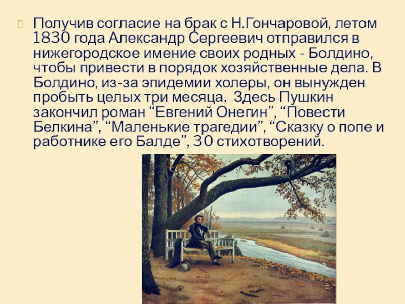 Слайд 11Получив согласие на брак с Н.Гончаровой, летом 1830 года Александр Сергеевич