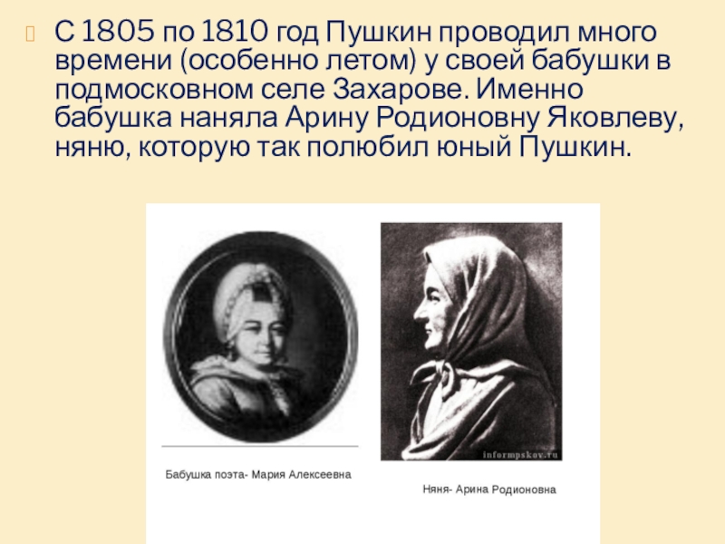 у своей бабушки в подмосковном селе Захарове. Именно бабушка наняла Арину Родионовну Яковлеву, няню, которую так полюбил юный Пушкин.