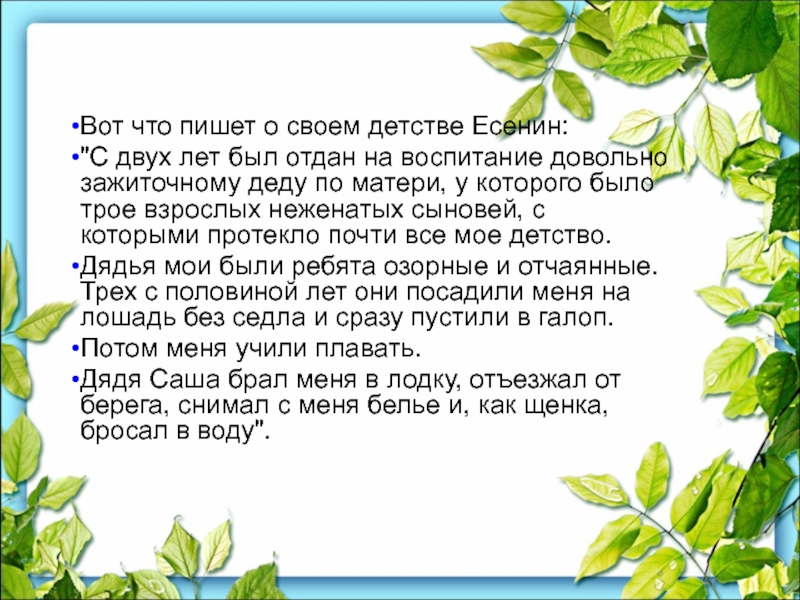 Слайд 6Вот что пишет о своем детстве Есенин: