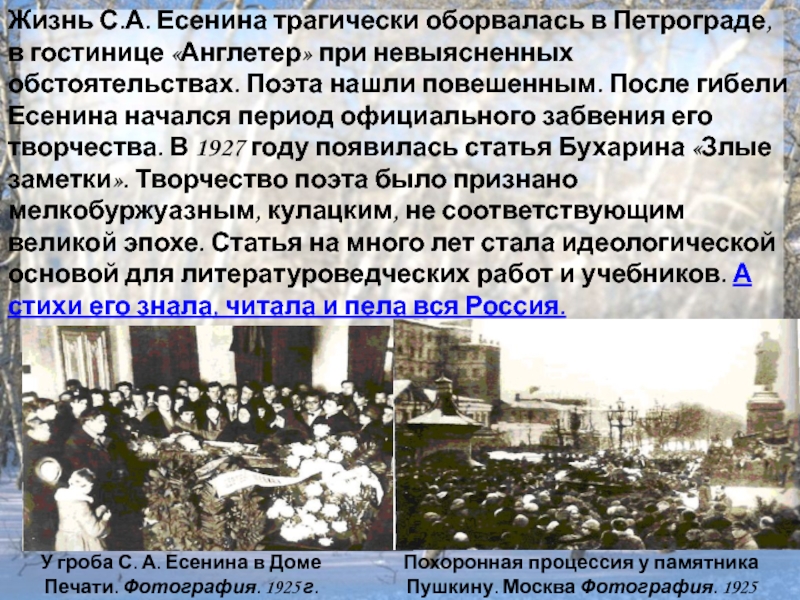 невыясненных обстоятельствах. Поэта нашли повешенным. После гибели Есенина начался период официального забвения его творчества. В 1927 году появилась статья Бухарина «Злые заметки». Творчество поэта было признано мелкобуржуазным, кулацким, не соответствующим великой эпохе. Статья на много лет стала идеологической основой для литературоведческих работ и учебников. А стихи его знала, читала и пела вся Россия.