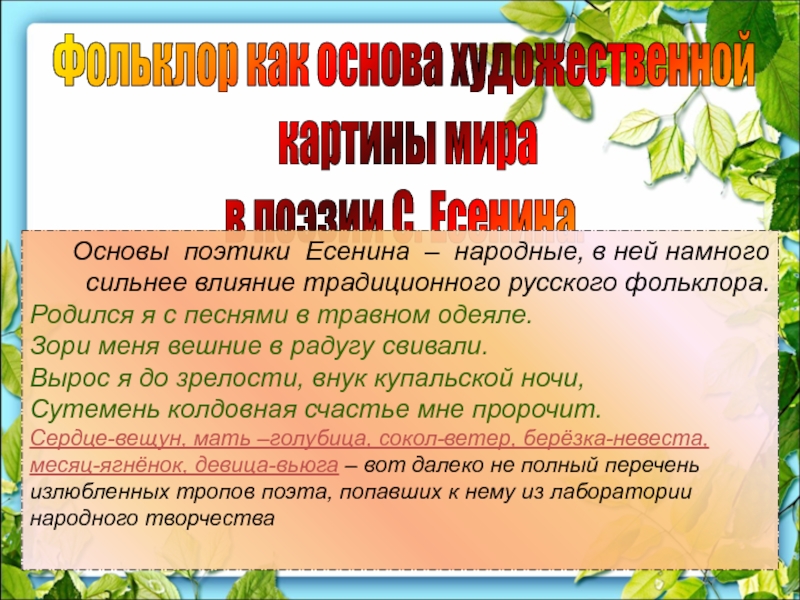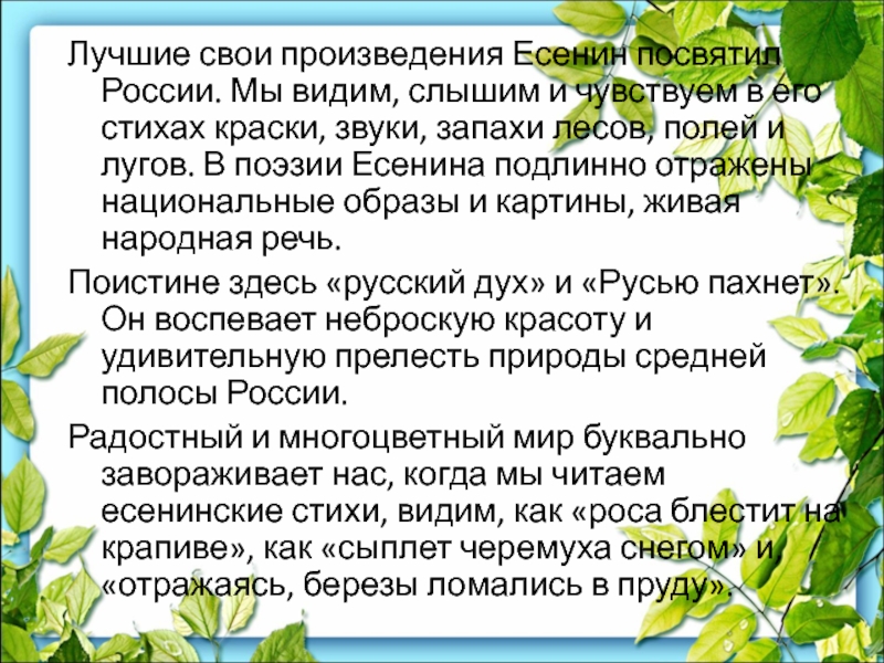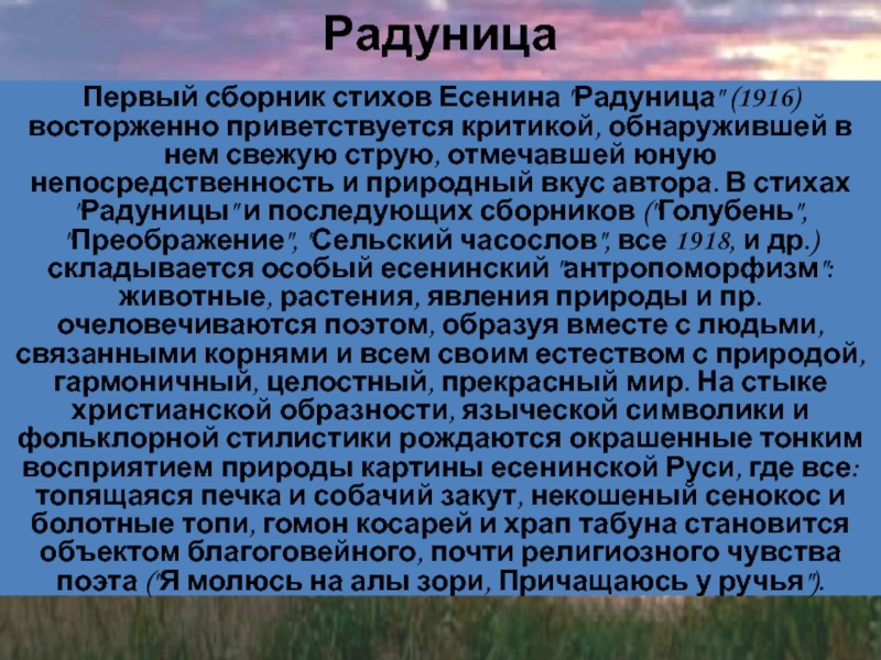 нем свежую струю, отмечавшей юную непосредственность и природный вкус автора. В стихах "Радуницы" и последующих сборников ("Голубень", "Преображение", "Сельский часослов", все 1918, и др.) складывается особый есенинский "антропоморфизм": животные, растения, явления природы и пр. очеловечиваются поэтом, образуя вместе с людьми, связанными корнями и всем своим естеством с природой, гармоничный, целостный, прекрасный мир. На стыке христианской образности, языческой символики и фольклорной стилистики рождаются окрашенные тонким восприятием природы картины есенинской Руси, где все: топящаяся печка и собачий закут, некошеный сенокос и болотные топи, гомон косарей и храп табуна становится объектом благоговейного, почти религиозного чувства поэта ("Я молюсь на алы зори, Причащаюсь у ручья").
