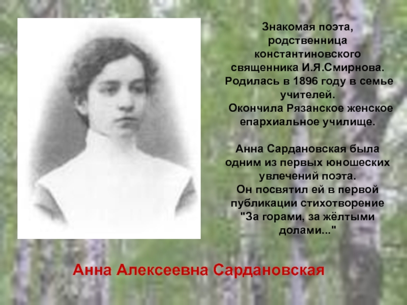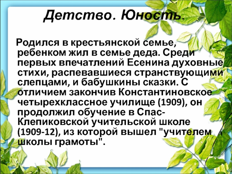 семье деда. Среди первых впечатлений Есенина духовные стихи, распевавшиеся странствующими слепцами, и бабушкины сказки. С отличием закончив Константиновское четырехклассное училище (1909), он продолжил обучение в Спас-Клепиковской учительской школе (1909-12), из которой вышел "учителем школы грамоты".