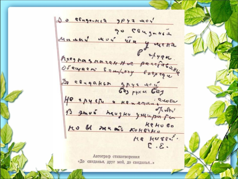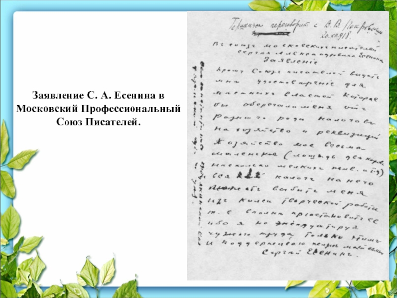 Слайд 24Заявление С. А. Есенина в Московский Профессиональный Союз Писателей.