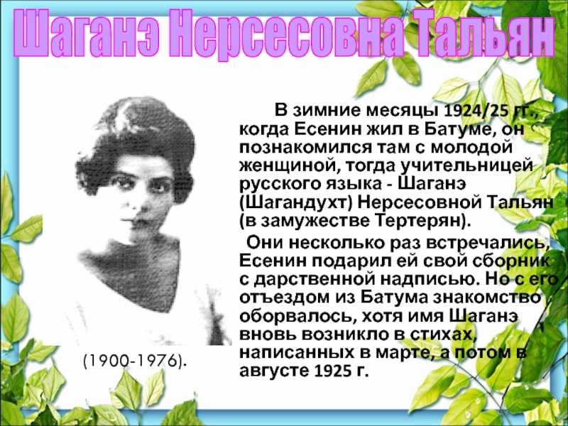 Они несколько раз встречались, Есенин подарил ей свой сборник с дарственной надписью. Но с его отъездом из Батума знакомство оборвалось, хотя имя Шаганэ вновь возникло в стихах, написанных в марте, а потом в августе 1925 г.