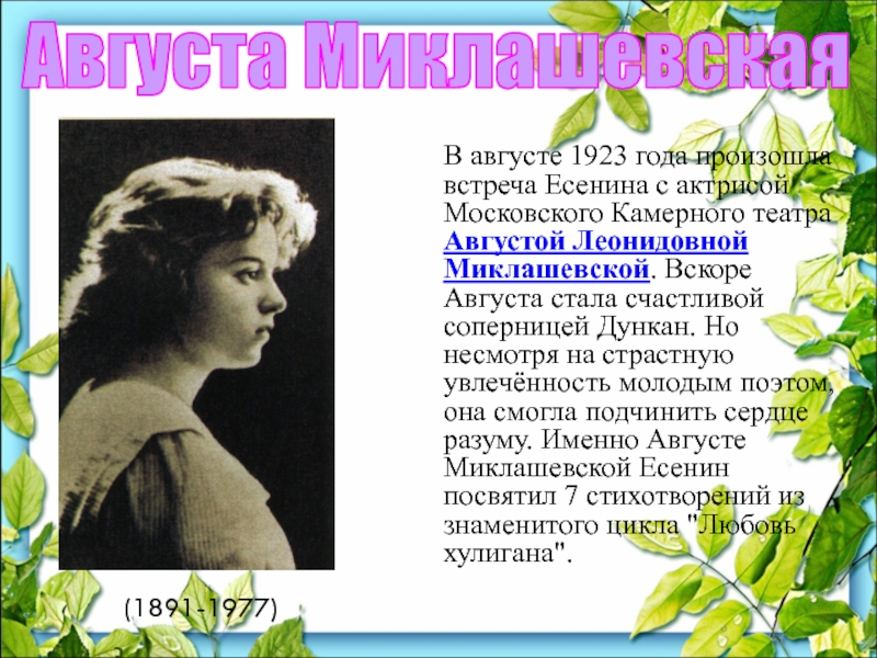 актрисой Московского Камерного театра Августой Леонидовной Миклашевской. Вскоре Августа стала счастливой соперницей Дункан. Но несмотря на страстную увлечённость молодым поэтом, она смогла подчинить сердце разуму. Именно Августе Миклашевской Есенин посвятил 7 стихотворений из знаменитого цикла "Любовь хулигана".