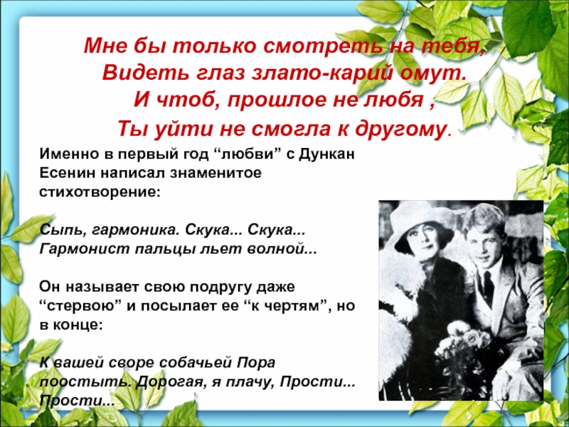 Именно в первый год “любви” с Дункан Есенин написал знаменитое стихотворение:
