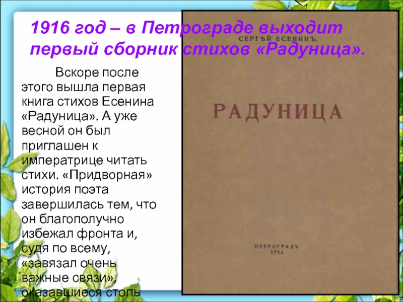 Слайд 18 Вскоре после этого вышла первая книга стихов Есенина «Радуница». А уже