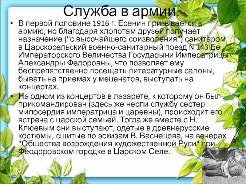 В первой половине 1916 г. Есенин призывается в армию,
