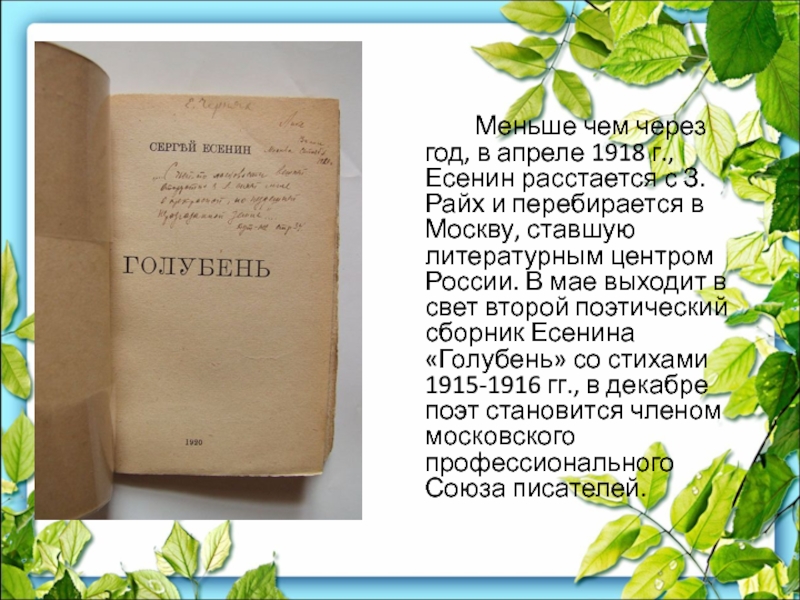З. Райх и перебирается в Москву, ставшую литературным центром России. В мае выходит в свет второй поэтический сборник Есенина «Голубень» со стихами 1915-1916 гг., в декабре поэт становится членом московского профессионального Союза писателей.