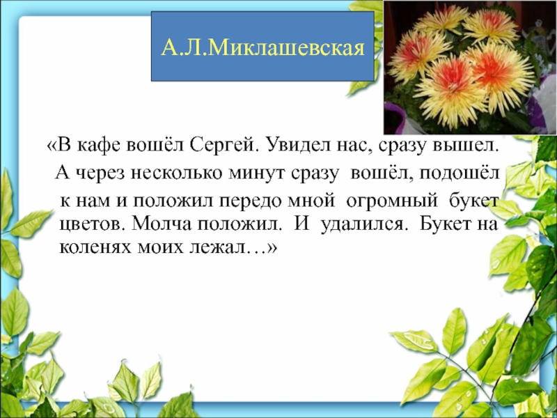 к нам и положил передо мной огромный букет цветов. Молча положил. И удалился. Букет на коленях моих лежал…»