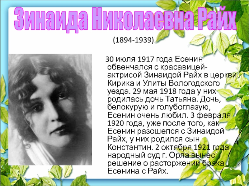 года Есенин (21 год) обвенчался с актрисой Зинаидой Райх в церкви Кирика и Улиты Вологодского уезда.