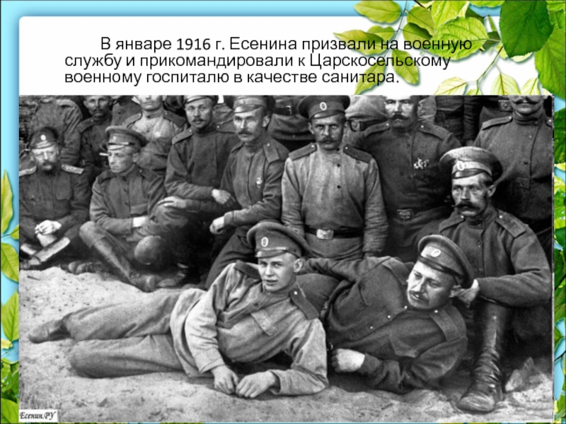 Слайд 14 В январе 1916 г. Есенина призвали на военную службу и прикомандировали
