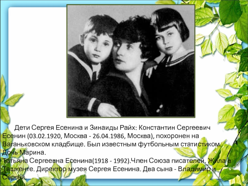 Слайд 21 Дети Сергея Есенина и Зинаиды Райх: Константин Сергеевич Есенин (03.02.1920, Москва