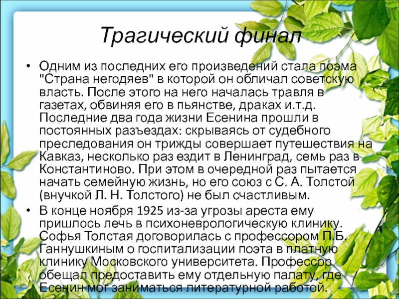 которой он обличал советскую власть. После этого на него началась травля в газетах, обвиняя его в пьянстве, драках и.т.д. Последние два года жизни Есенина прошли в постоянных разъездах: скрываясь от судебного преследования он трижды совершает путешествия на Кавказ, несколько раз ездит в Ленинград, семь раз в Константиново. При этом в очередной раз пытается начать семейную жизнь, но его союз с С. А. Толстой (внучкой Л. Н. Толстого) не был счастливым.