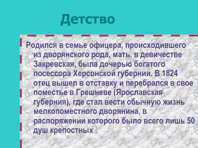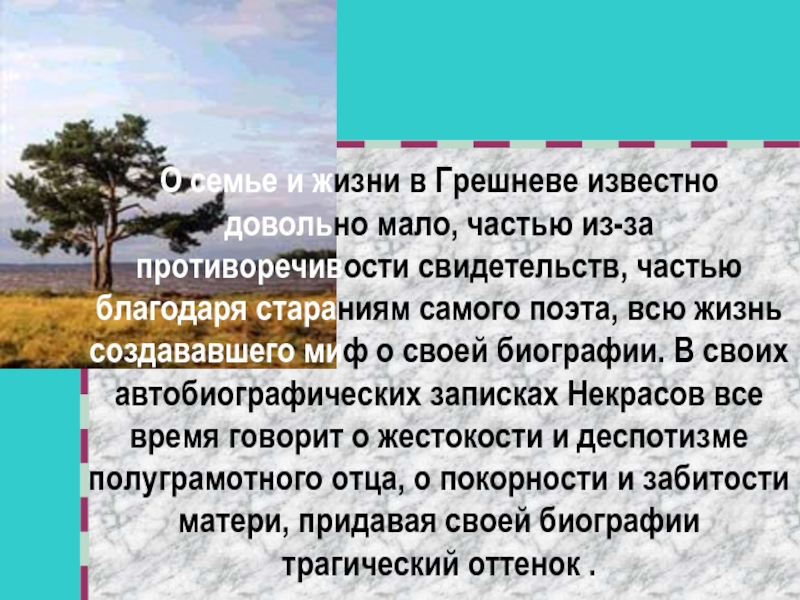 противоречивости свидетельств, частью благодаря стараниям самого поэта, всю жизнь создававшего миф о своей биографии. В своих автобиографических записках Некрасов все время говорит о жестокости и деспотизме полуграмотного отца, о покорности и забитости матери, придавая своей биографии трагический оттенок .