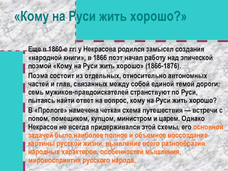 замысел создания «народной книги», в 1866 поэт начал работу над эпической поэмой «Кому на Руси жить хорошо» (1866-1876).
