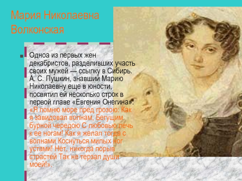 — ссылку в Сибирь. А. С. Пушкин, знавший Марию Николаевну еще в юности, посвятил ей несколько строк в первой главе «Евгения Онегина»: «Я помню море пред грозою: Как я завидовал волнам, Бегущим бурной чередою С любовью лечь к ее ногам! Как я желал тогда с волнами Коснуться милых ног устами! Нет, никогда порыв страстей Так не терзал души моей!».