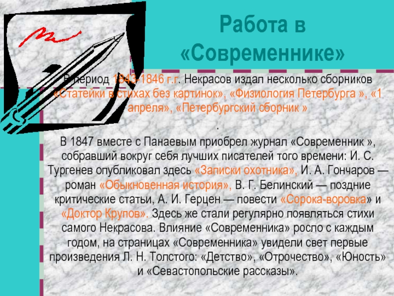 В 1847 вместе с Панаевым приобрел журнал «Современник », собравший вокруг себя лучших писателей того времени: И. С. Тургенев опубликовал здесь «Записки охотника», И. А. Гончаров — роман «Обыкновенная история», В. Г. Белинский — поздние критические статьи, А. И. Герцен — повести «Сорока-воровка» и «Доктор Крупов». Здесь же стали регулярно появляться стихи самого Некрасова. Влияние «Современника» росло с каждым годом, на страницах «Современника» увидели свет первые произведения Л. Н. Толстого: «Детство», «Отрочество», «Юность» и «Севастопольские рассказы».