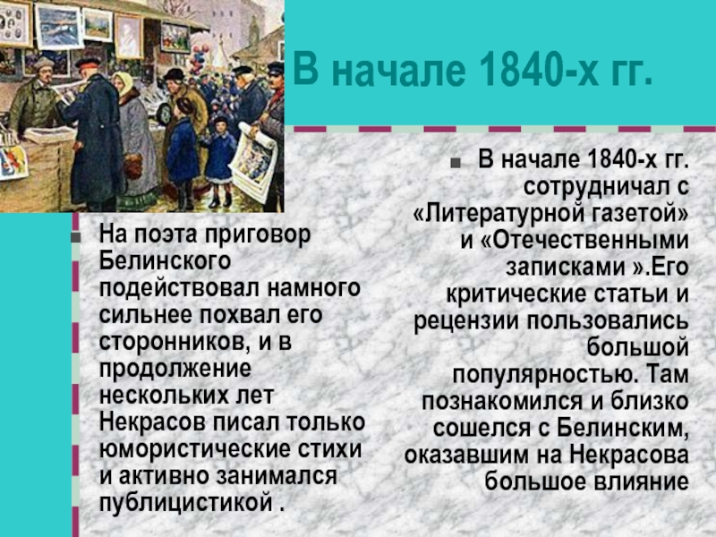 В начале 1840-х гг. сотрудничал с «Литературной газетой» и «Отечественными записками ».Его критические статьи и рецензии пользовались большой популярностью. Там познакомился и близко сошелся с Белинским, оказавшим на Некрасова большое влияние