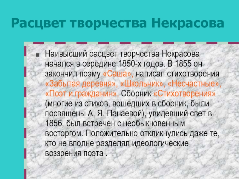 Наивысший расцвет творчества Некрасова начался в середине 1850-х годов.