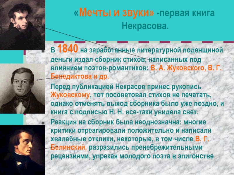 Перед публикацией Некрасов принес рукопись Жуковскому, тот посоветовал стихов не печатать, однако отменять выход сборника было уже поздно, и книга с подписью Н. Н. все-таки увидела свет.