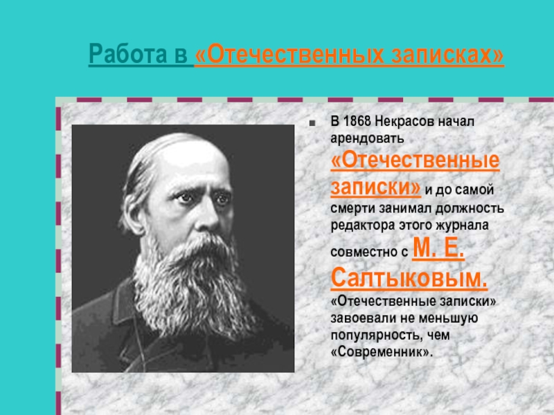 В 1868 Некрасов начал арендовать «Отечественные записки» и