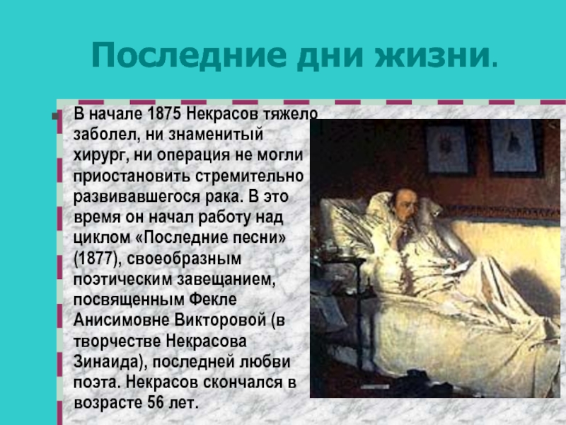 ни операция не могли приостановить стремительно развивавшегося рака. В это время он начал работу над циклом «Последние песни» (1877), своеобразным поэтическим завещанием, посвященным Фекле Анисимовне Викторовой (в творчестве Некрасова Зинаида), последней любви поэта. Некрасов скончался в возрасте 56 лет.