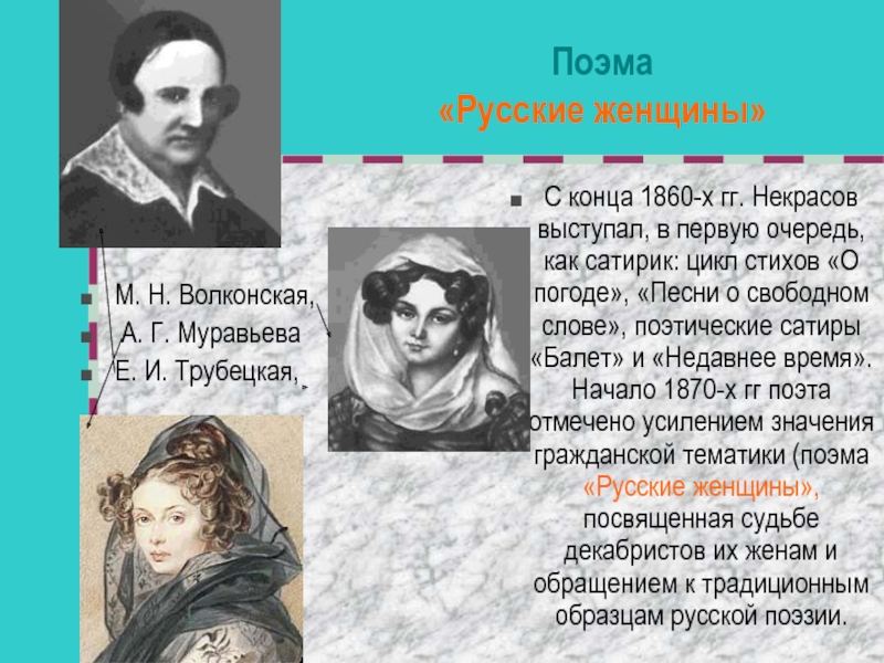 С конца 1860-х гг. Некрасов выступал, в первую очередь, как сатирик: цикл стихов «О погоде», «Песни о свободном слове», поэтические сатиры «Балет» и «Недавнее время». Начало 1870-х гг поэта отмечено усилением значения гражданской тематики (поэма «Русские женщины», посвященная судьбе декабристов их женам и обращением к традиционным образцам русской поэзии.