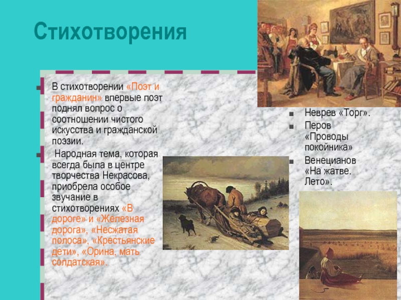 Народная тема, которая всегда была в центре творчества Некрасова, приобрела особое звучание в стихотворениях «В дороге» и «Железная дорога», «Несжатая полоса», «Крестьянские дети», «Орина, мать солдатская».