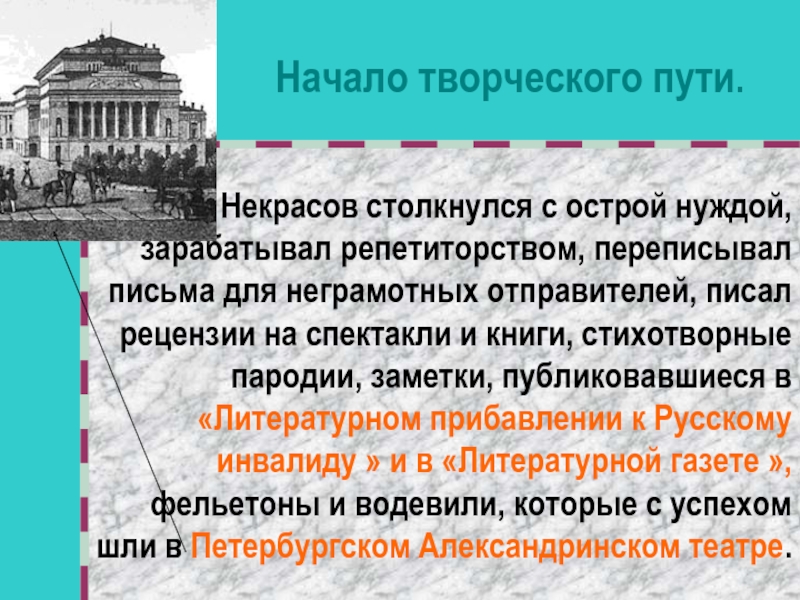 нуждой, зарабатывал репетиторством, переписывал письма для неграмотных отправителей, писал рецензии на спектакли и книги, стихотворные пародии, заметки, публиковавшиеся в «Литературном прибавлении к Русскому инвалиду » и в «Литературной газете », фельетоны и водевили, которые с успехом шли в Петербургском Александринском театре.