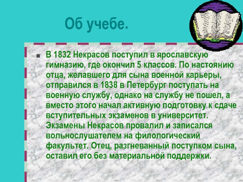 классов. По настоянию отца, желавшего для сына военной карьеры, отправился в 1838 в Петербург поступать на военную службу, однако на службу не пошел, а вместо этого начал активную подготовку к сдаче вступительных экзаменов в университет. Экзамены Некрасов провалил и записался вольнослушателем на филологический факультет. Отец, разгневанный поступком сына, оставил его без материальной поддержки.
