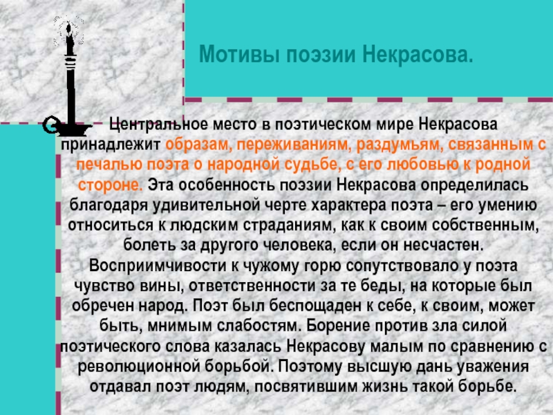 раздумьям, связанным с печалью поэта о народной судьбе, с его любовью к родной стороне. Эта особенность поэзии Некрасова определилась благодаря удивительной черте характера поэта – его умению относиться к людским страданиям, как к своим собственным, болеть за другого человека, если он несчастен. Восприимчивости к чужому горю сопутствовало у поэта чувство вины, ответственности за те беды, на которые был обречен народ. Поэт был беспощаден к себе, к своим, может быть, мнимым слабостям. Борение против зла силой поэтического слова казалась Некрасову малым по сравнению с революционной борьбой. Поэтому высшую дань уважения отдавал поэт людям, посвятившим жизнь такой борьбе.