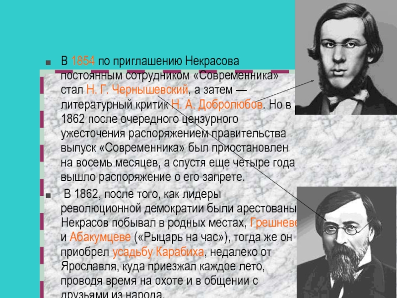 Чернышевский, а затем — литературный критик Н. А. Добролюбов. Но в 1862 после очередного цензурного ужесточения распоряжением правительства выпуск «Современника» был приостановлен на восемь месяцев, а спустя еще четыре года вышло распоряжение о его запрете.