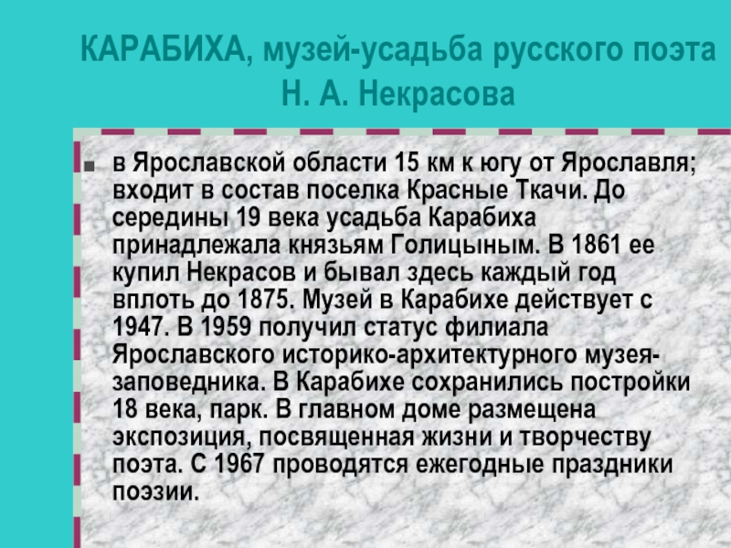 к югу от Ярославля; входит в состав поселка Красные Ткачи. До середины 19 века усадьба Карабиха принадлежала князьям Голицыным. В 1861 ее купил Некрасов и бывал здесь каждый год вплоть до 1875. Музей в Карабихе действует с 1947. В 1959 получил статус филиала Ярославского историко-архитектурного музея-заповедника. В Карабихе сохранились постройки 18 века, парк. В главном доме размещена экспозиция, посвященная жизни и творчеству поэта. С 1967 проводятся ежегодные праздники поэзии.